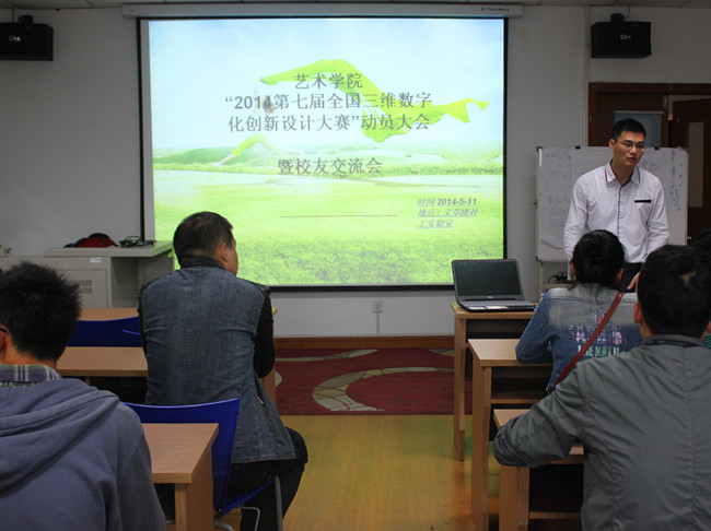为积极备战“2014第七届全国三维数字化创新设计大赛”(简称3D大赛),继续推动3D技术应用与创新创业型人才培养,激发艺术学子创意创业、实践成才的热情,艺术于5月11日上午在文彰楼社工实验室召开了3D大赛动员大会暨校友经验交流会。此次会议有幸邀请到了校关工委退休教师任衣伟、2010届校友王虎作专题报告,院辅导员老师及20余名参赛同学参加了大会。