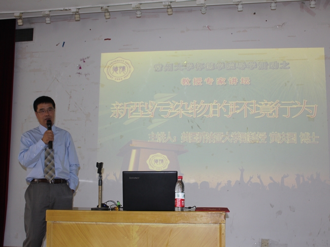 近日,怀德学院在图书馆报告厅开展教授专家讲坛之“新型污染物的环境行为” 讲座。讲座有幸邀请美国乔治亚大学副教授黄庆国博士主讲,院领导班子全体成员、各教研室负责人、老师、全体辅导员及各年级相关专业学生参加此次讲座。