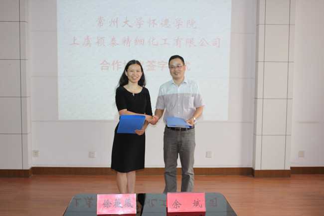 双方决定在“人才输送”、“共建实习基地”等方面进行全方位合作,建立长期稳定的校企合作关系。怀德学院在上虞颖泰精细化工有限公司设立“常州大学怀德学院就业实习基地”。怀德学院副院长徐薇薇,上虞颖泰精细化工有限公司企管部经理余斌分别在合作协议文本上签字。