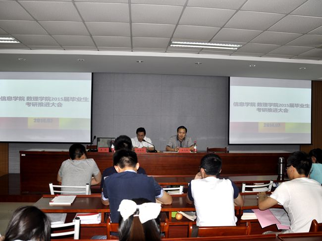为调动学生考研的积极性,解答学生考研的相关疑惑,帮助考研学生更好地进行复习,促进学院学风和考风建设的发展,信息学院、数理学院于近日在文约楼314会议室召开2015届毕业生考研推进大会。院党委书记徐明华、院党委副书记储志新、2015届毕业班辅导员和考研学生参加了大会。