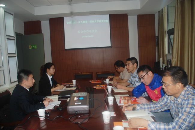 刘志毅总经理在讲话中简要介绍了安博集团人众人公司发展情况,分享了公司与各大企业、高校、政府机关的合作经验,并提出与学院的合作设想。他指出,在学生选专业前或毕业前可以派公司专业人员来校宣讲(讲座)或带学生到公司基地进行专业认知,使学生了解户外拓展产业前景;挂牌成立常州大学休闲体育实训基地,为学生提供实习实训岗位;与体育学院共享培训课程等,以达到校企共赢的目的。