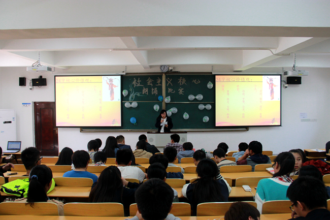10月23日中午,怀德学院“社会主义核心价值观”朗诵比赛决赛在怀德楼A104精彩举行,相关负责人担任此次比赛的评委。近百名同学观看了此次比赛。