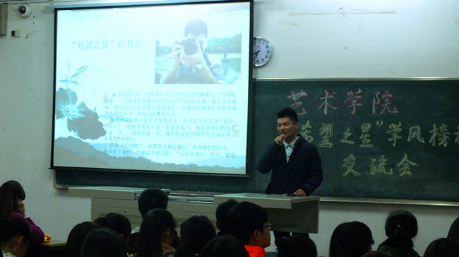 11月20日至24日,艺术学院“学业之星”张慧玲,“社团之星”孙哲琪、冯碧琪,“时代之星”陆晨煜、周喆,“励志之星”莫开焕、邵帅帅七位同学分别与大一新生作了专场交流。七位“学风明星”根据自己的特长和兴趣,分别从如何树立学习目标、如何正确处理学习与活动的关系、加强专业知识学习的重要性、如何规划大学生活、如何建立好人际关系、如何正确处理好个人能力和未来发展等方面,与新生分享了各自的学习、工作和生活经验。