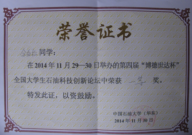 本次论坛以“科技启迪智慧 创新造就未来”为主题,旨在营造良好学术科技氛围,促进大学生之间的创新实践交流与协作,增强大学生科技创新能力,造就一批适应社会发展需要的高层次石油科技人才。论坛设油气田开发工程、钻完井工程、海洋石油工程、石油地质与勘探、油气储运、石油炼化、石油机械等7个分论坛,共收到学术论文投稿300余篇,举行大学生优秀论文报告会58场,专家报告会1场。最终,论坛评选出特等奖论文1篇、一等奖论文3篇、二等奖论文7篇、三等奖论文11篇、优秀论文36篇。我院余益松同学的论文《纳米石墨颗粒对气体水合物生成影响研究》获一等奖,龙凤仪同学的论文《304不锈钢点蚀行为的微区电化学研究》和张锦同学的论文《离子液体水合物反应液表面张力的实验研究》分别获大赛优秀奖。