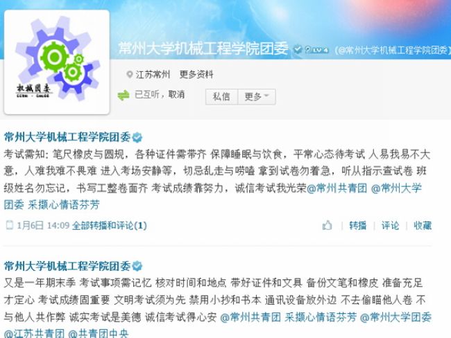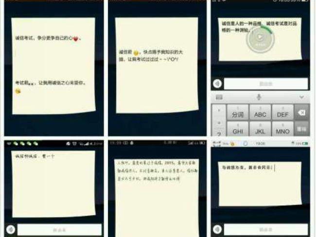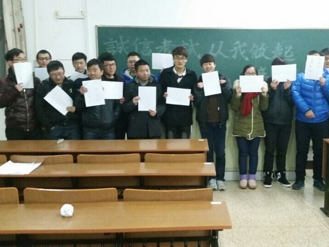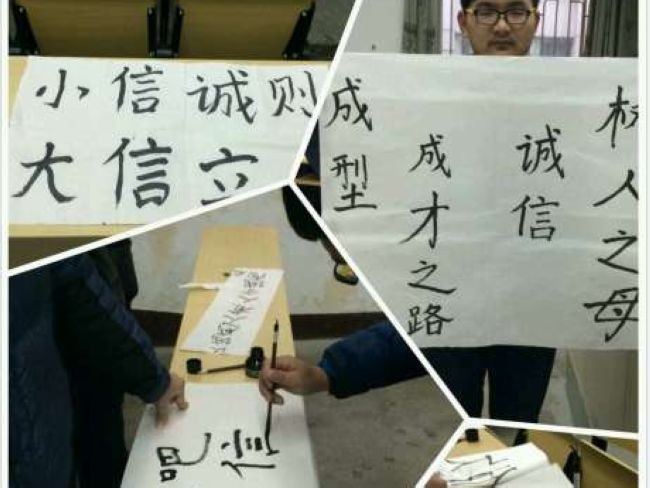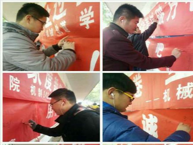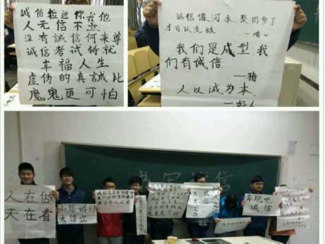 前期,在大学生实名制社交平台“PU口袋”在线发起的“温书迎诚考”主题教育活动得到了五百余名同学的广泛参与。在学院官方腾讯微博上发布学生自编的“诚信小贴士、诚信小口诀”得到了大家的一致好评。1月8日中午,在武进、白云两校区同时进行了PU口袋诚信“微”签到和横幅签名活动。车辆14班的“厉兵秣马迎期末,我与诚信约个会”;装备14的“自信驱动笔杆,诚信祝我成功”“诚信——海阔天空,作弊——走投无路”等近30条横幅成为校园内的一道靓丽风景。与此同时,近千名学生利用手机微信进行诚信考试“漂流瓶”投放活动,并得到了广大微友的积极响应。各团支部还开展了自发组织的形式多样的诚信考试教育活动来积极回应。