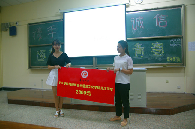 5月31日晚,艺术学院学生会主席冯碧琪将义卖所得的2800元移交给了周有光语言文化学院日语141班班长陈岩,捐献给因突发心肌炎正在住院治疗的范滢同学。艺术学院用爱心的力量鼓励、帮助身边的同学,祝愿范滢同学早日恢复健康!