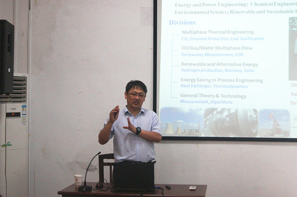 白教授从自身研究方向出发,结合石油领域现状,向现场师生介绍了Natural Gas Separation Using Graphene Membrane, Nucleation Model for Non-Ideal Binary Mixtures at High Pressure, Drop Entrainment in Gas-liquid Churn Flow等三个方面的研究成果。