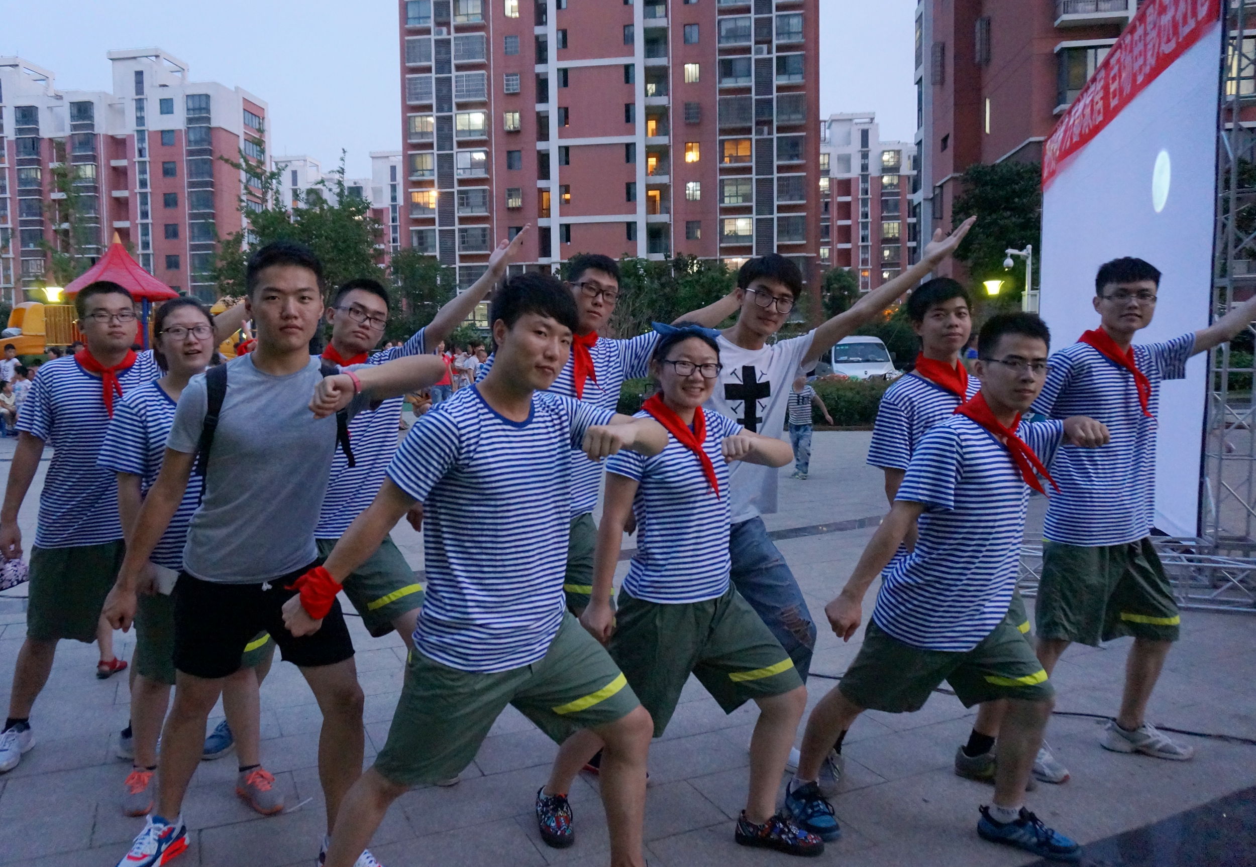 红领巾,海魂衫,国防绿;拉丁,hip-hop,爵士舞。近日,新北区龙虎塘街道祥龙社区露天电影播放间隙多了一场来自常州大学机械工程学院城市轨道交通学院的快闪Show。