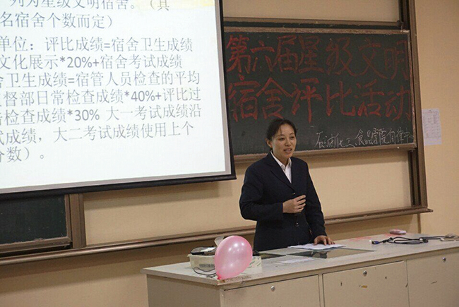 为强化学生宿舍管理,营造温馨和谐的宿舍生活学习氛围,石油化工学院食品学院于11月6日下午在W7阶举办了第六届星级文明宿舍评比活动的启动仪式。出席活动的有报名参加活动的各宿舍成员、院自律中心骨干、学生宿舍九号楼宿管阿姨。