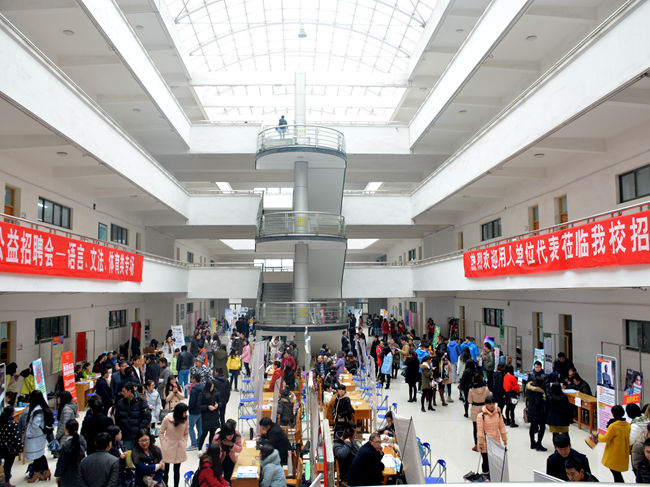 12月20日,由常州大学就业指导中心、周有光语言文化学院、史良法学院和体育学院联合主办的“常州大学2016届毕业生校园公益招聘会(语言、文法、体育类专场)”在教学辅楼大厅举办。周有光语言文化学院、史良法学院和体育学院2016届全体本科生参加了此次招聘会,学生处、周有光语言文化学院、史良法学院和体育学院的相关领导来到招聘现场与用人单位交流,并对应聘的学生给予全程指导。