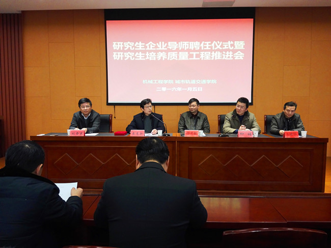 1月5日下午,机械工程学院 城市轨道交通学院研究生企业导师聘任仪式暨研究生培养质量工程推进会议在机械石油楼报告厅举行。中石化金陵石化公司副总工程师任名晨、江苏如石机械有限公司董事长刘志刚、江苏巨能机械有限公司董事长牟富君、江苏新纪元环保有限公司董事长丁南华、常州大学研究生部副主任王建华、学院领导班子以及学院全体研究生导师出席了会议。