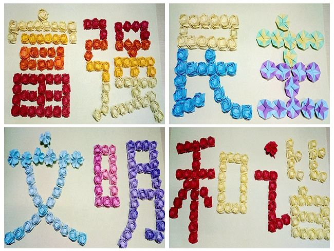不用推刀裁剪,不用胶水固定,纯手工折捏而成的牵牛等千余朵纸花组成核心价值观12词作品一经亮相便吸引了评审现场的无数歆羡的眼光。“折纸是以一张无损伤的完整正方形纸张折成各种不同形状的艺术活动,我和折纸的结缘是在国家首个烈士纪念日活动中。此后,我在‘常大剪纸哥’丁浩的影响下,想以自己的方式创作属于自己的作品。为了准备此次团日活动,我和同学前后忙了有半年之多。纸花中最难折的是蔷薇,一朵就得花费6、7分钟的时间。”山西大同女孩武嘉莹向记者介绍到。