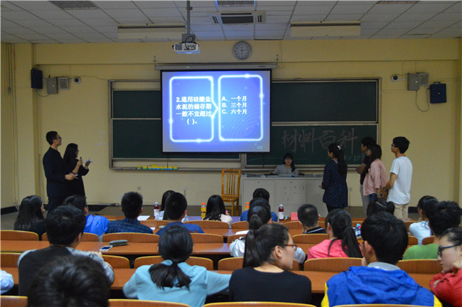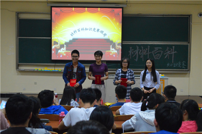 本次比赛共分为四个环节:在第一环节各展风采,参赛选手分别回答十二道关于材料应用、分类等方面的问题;第二环节各小组群雄争霸,各队代表在限定时间十秒内进行抢答,各出奇招的抢答,机智准确的回答赢得了阵阵掌声;在第三环节进行极限挑战,各小队抽签作答,运气与实力并重;最后一个环节最为激烈精彩,难中易三个档次的自由选择答题给落后的小组最后的机会,第二小队绝地反击,逆袭成功,获得了最后的胜利,掌声欢呼不绝于耳,比赛就此宣告结束。