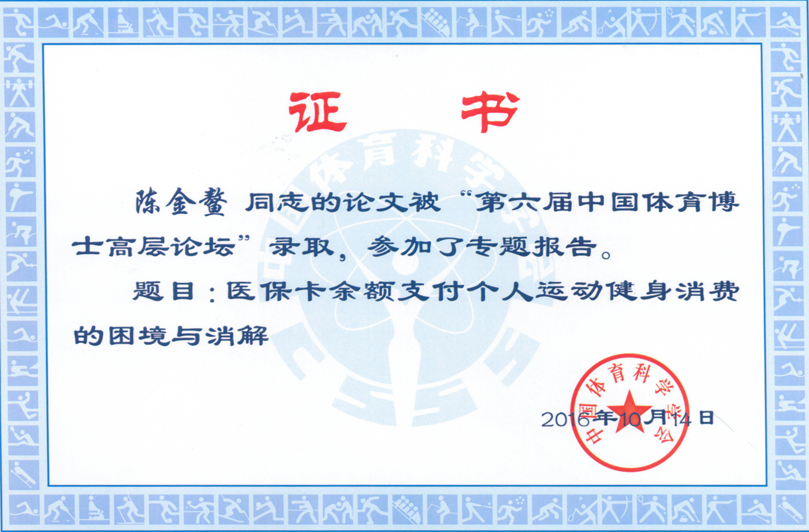 近日,由中国体育科学学会主办,浙江师范大学承办的“第六届中国体育博士高层论坛”在浙江金华举行。本届论坛的主题是“国家战略下的体育与社会进步”,共吸引来自全国高等体育院校及体育总局等机构的近100位博士参加。体育学院教师陈金鳌博士受邀参加本次论坛,并在专题分会上作了题为《医保卡余额支付个人运动健身消费的困境与消解》的论文报告和交流。