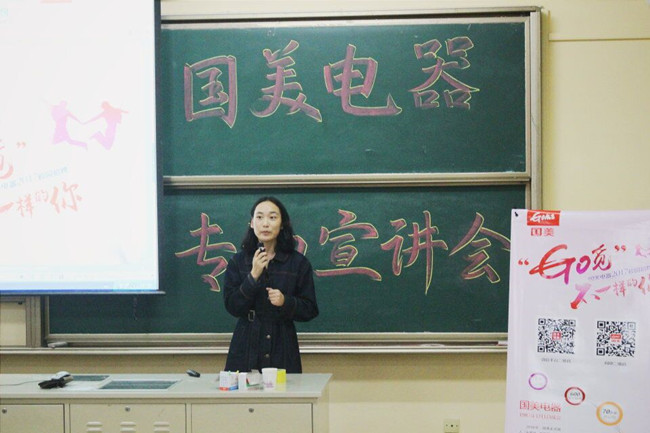 会上,王经理详细介绍了国美的发展状况,阐述了2016全渠道战略,并讲解了在国美经营中,线上线下的消费界限将趋向于模糊化。同时,她也介绍了企业的蓄水池人才工程。一方面是企业针对优秀高校毕业生进行快速培养,为优秀高校毕业生提供平等进入国美门店核心岗位的机会;另一方面是针对大一、大二学生进行短期实习的未来星计划。最后,活动播放了宣传视频、介绍了该工程培养的优秀代表,并邀请门店店长分享了作为培训对象的经历和感受。会后,经理与有意向应聘的同学进行了深入交流。
