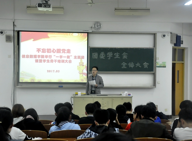 为深入贯彻共青团中央关于在全体团员中开展“学习总书记讲话 做合格共青团员”教育实践活动的要求,5月4日,信息数理学院在W17阶举行“一学一做”主题团课暨学生骨干培训大会。院团委学生会所有成员和各年级班团干部参加了此次大会,大会由院团委书记王欢主持。