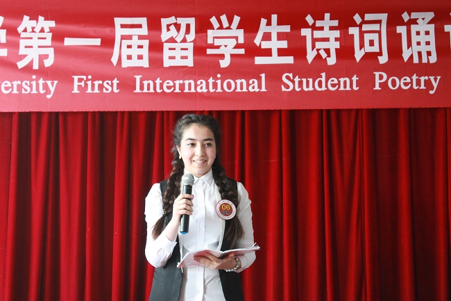诗词诵读大赛现场,来自10余个国家的选手们各显身手,一首首耳熟能详的诗词经过留学生的朗诵而别具风味。乌兹别克斯坦的阿里同学吟唱了一首《水调歌头》,形式新颖,耐人寻味。泰国学生许意盛的《沁园春·雪》得到了现场的阵阵掌声;毛里求斯学生梁玉瑞演绎的《关雎》似绝美女子造访仙境;《乡愁》、《九月九日忆山东兄弟》表达了异国学子对家乡亲人的无尽思念,令人动容。留学生的发音有的不是非常标准,但那坚定的眼神、铿锵有力的声调深深感染了现场的观众。评委对留学生的诗词诵读做了现场点评,并进行了中国文化知识提问。最后,哈萨克斯坦学生施朗弹唱的《从前慢》获得最佳风采奖,泰国的两名选手获得一等奖。