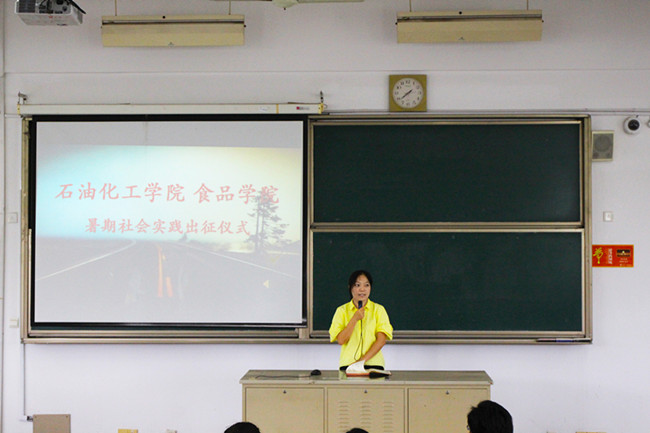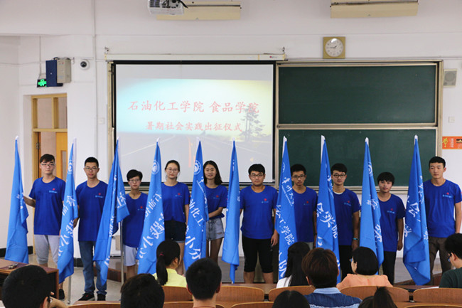 7月5日下午,石油化工学院食品学院2017年暑期社会实践出征仪式在W18阶梯教室举行。院党委副书记宣慧、菁英临时党支部社会实践党小组全体成员和社会实践学生代表150余人参加仪式。出征仪式由院团委周本卫老师主持。