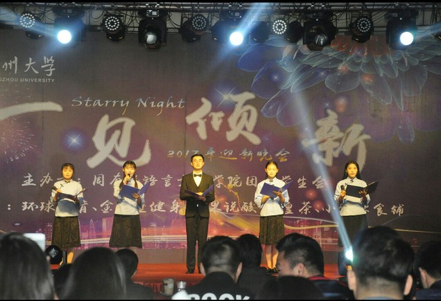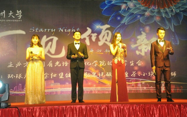 Follow乐队的澎湃热情在晚会的开始燃烧了全场,一场视听盛宴在尖叫和欢呼声中拉开了帷幕。晚会共设14个精彩纷呈的节目以及游戏和抽奖环节。《诗韵中华》诵的是中华心,道不清的是中华情。桃之夭夭,灼灼其华,那柔婉的舞姿,动情的眼眸,是少女百转千回的绵绵情话。小品《甄嬛后传》诙谐幽默,其中渗透了十九大精神,妙笔生花。四国语言歌曲串烧,让我们深刻体会了语言之美、文化之思。院学生会男生部长的《咋了爸爸+告白气球》将晚会推向了高潮。此外,2016年校十佳歌手冠军凌杰、心韵演绎社和DS街舞社倾情加盟,带动了全场热烈的气氛。最后,学院学生干部共同与葛舒阳老师合唱《不忘初心》。歌声婉转动听,响彻夜空,向我们共同诉说着一个温情的秘密。