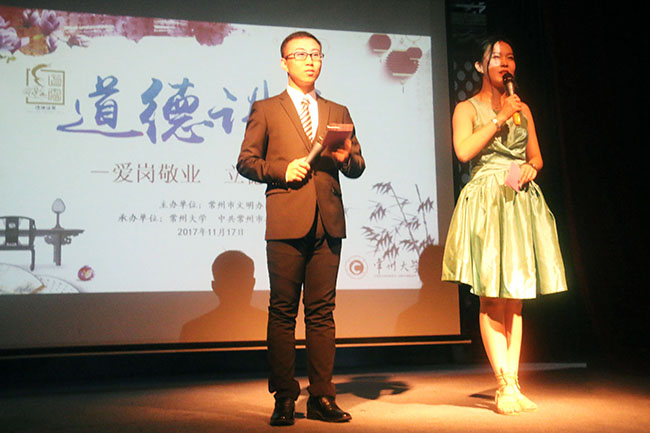 11月17日下午,由常州市文明办主办,常州大学和中共常州市委办公室联合承办、“爱岗敬业 立德树人”主题的常州道德讲堂在常州道德讲堂总堂举行。中共常州市委办公室机关党委部分党员代表、常州市文明办部分代表、常州大学部分师生以及广大市民代表到场聆听常州大学商学院张普老师的道德故事。