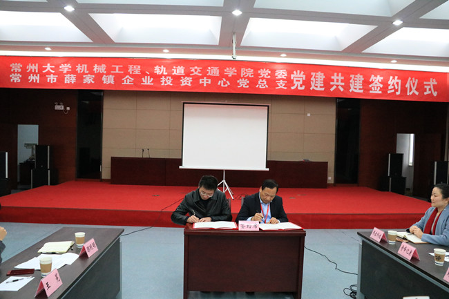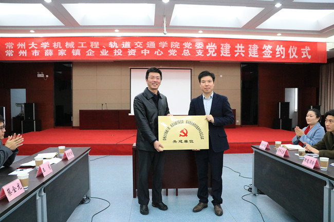 柳铭、徐俊为常州大学机械工程学院、城市轨道交通学院党委、薛家镇企业投资服务中心党总支部共建揭牌。柳铭和景国民共同签订党建共建协议书。常州伟泰科技股份有限公司、常州青峰亿康机械有限公司、常州环能涡轮动力股份有限公司分别与常州大学机械工程学院、城市轨道交通学院签订产学研合作协议。