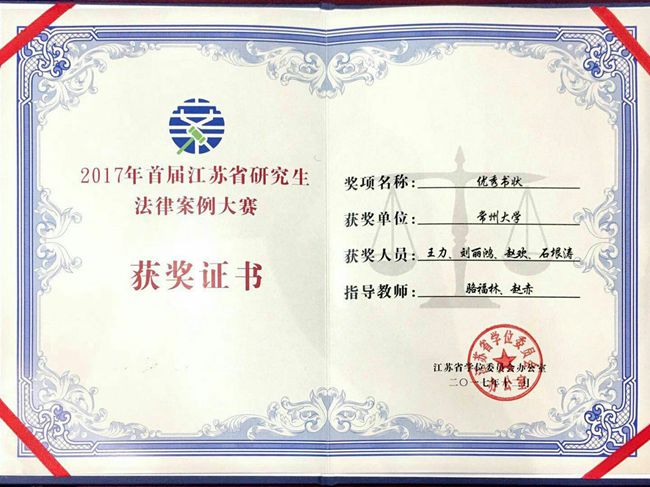 12月1-3日,由江苏省学位委员会办公室主办、苏州大学承办的首届江苏省研究生法律案例大赛在苏州举行。常州大学代表队言词辩论环节总成绩排名第八,书状竞赛环节总成绩排名第四,并荣获优秀书状奖,江苏省高级人民法院副院长褚红军为常州大学颁奖。