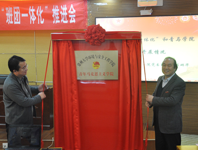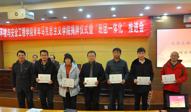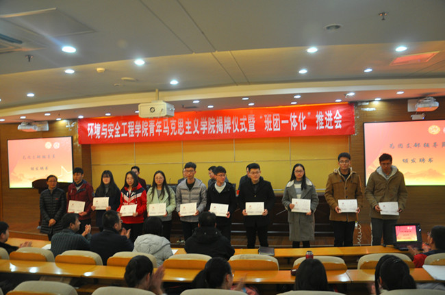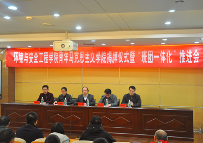 12月6日下午,环境与安全工程学院在图书馆报告厅举办了青年马克思主义学院揭牌仪式暨“班团一体化”推进会。校团委书记周晓东、副书记张精华,环境学院党委书记薛荣、党委副书记吕琳华,院学工办主任华德仁,院团委书记李彦杰,学工办辅导员裴孟、方姗姗出席会议。学院各团支部辅导员、学生骨干和青马培训班学员参加会议。会议由院团委书记李彦杰主持。