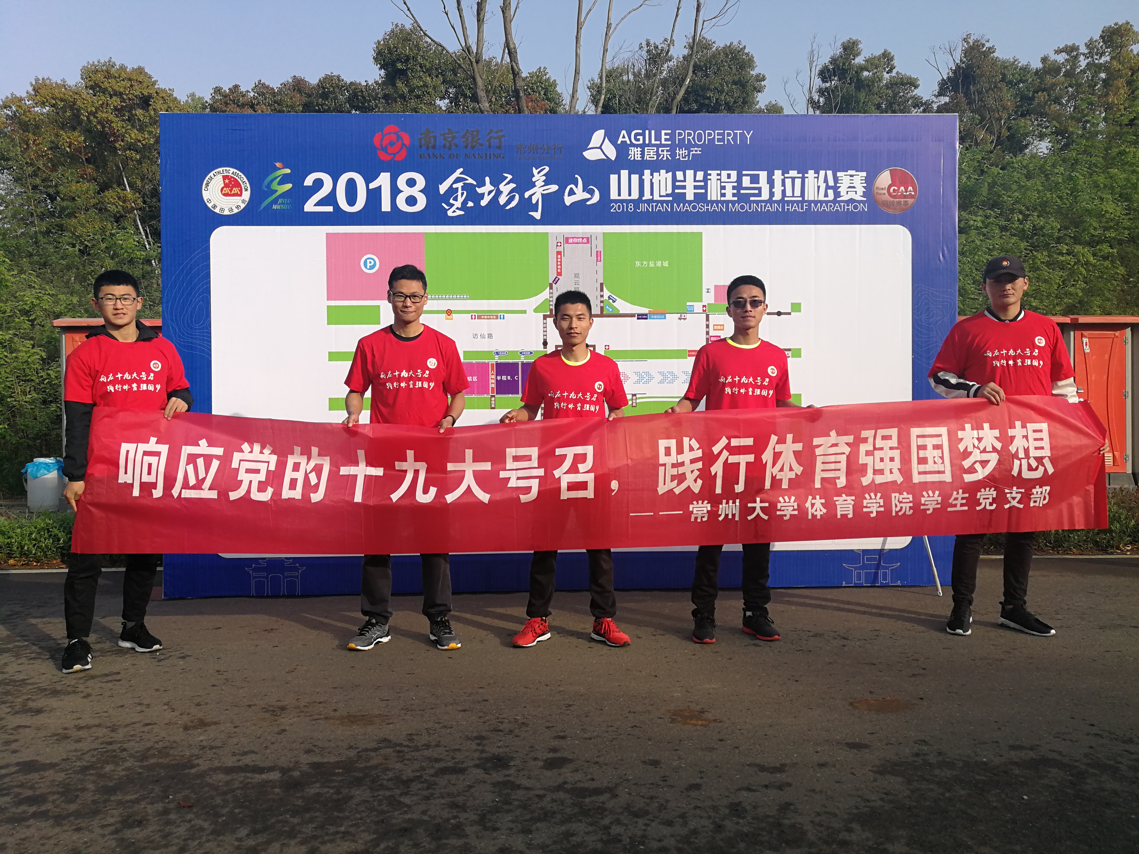习近平总书记在党的十九大报告中多次提到体育强国的相关内容,为践行体育强国梦想,4月15日,体育学院学生党支部组织党员、入党积极分子参加2018金坛茅山山地半程马拉松赛,以实际行动响应全民健身号召。