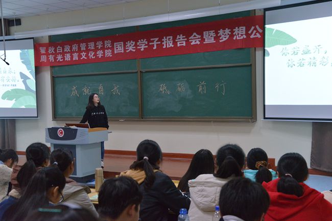 11月26号晚,瞿秋白政府管理学院、周有光语言文化学院国家奖学金学生先进事迹报告会暨学院梦想公开课在立德楼二阶举行。活动秉承“成就自我,砥砺前行”的主题,瞿秋白政府管理学院国家奖学金获得者丁晶、周有光语言文化学院国家奖学金获得者卢逸炜、李露露作为主讲嘉宾与大家交流分享大学生活以及学习感悟。瞿秋白政府管理学院、周有光语言文化学院学工办老师和2018级学生参加活动。