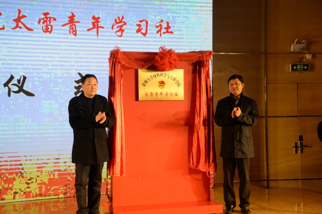 “诵英雄”环节播放了常州市张太雷纪念馆制作的一部讲述张太雷同志革命生涯的微电影——《谋将来永远幸福》,让大家对张太雷生平及其 “为自身独立,为家国奋斗”的精神有了更深的认识。“读箴言”环节由校第二届朗读大赛一等奖获得者石皓中朗读了一封张太雷写给他的妻子陆静华的家书,声情并茂的诵读让大家感受到了在那个战火纷飞的年代张太雷的家国情怀。常州三杰纪念馆副主任冯欣通过视频发来致辞,希望同学们传承太雷精神,认真学习党的理论思想。随后,郑云与汪国余共同为材料学院“太雷青年学习社”揭牌。