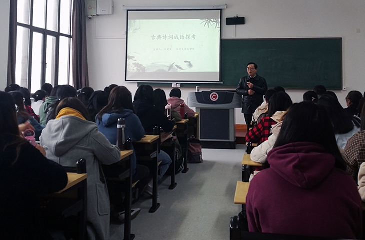 王建军用知识考古学的方法,对来源于古典诗词的成语作了追根溯源式的探究,并从来源辨析、分类解读、特征归纳和机制梳理等几个方面对古典诗词成语所蕴含的内在文化意蕴、符号生成机制和影响传播范式等进行了抽丝剥茧式的阐释。讲座中,王建军既结合“中国诗词大会”等当下古典诗词传播案例,也结合吴地风俗、风貌和区域文化历史,既为我校师生提供了一个深入了解和探究古典诗词成语的良好范例与学术引导,也为师生透过古典诗词成语更好地理解地方文化、区域文化提供了全新的视角与有益的启发。(通讯员 何伊凡)