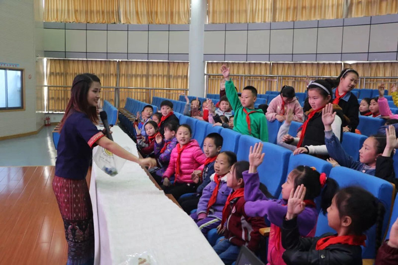 活动开始,主讲人通过演唱传统泰国歌曲活跃气氛拉近同小学生的距离。活动展示了泰国的国旗、气候、寺庙、国服和美食,并以模仿泰语的游戏将活动推向了高潮。