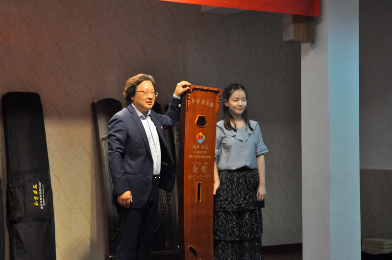 比赛结束后,艺术学院副院长熊祖鹏与淮安市淮安区琴筝协会会长、中筝国苑(淮安)文化传媒有限公司总经理贾宇共同为获奖选手颁奖。(通讯员 李思琦)