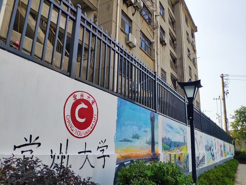 古运河旁同济桥至同安桥围墙总长600米,自东至西分为三个展示板块,分别为常州的过去、现在和将来。艺术学院志愿者团队负责“常州的现在”板块,他们手绘了常州恐龙园、江南环球港、常州紫荆公园和滆湖之星观光塔等地标性建筑,色彩丰富的油画风格体现了现代常州的活力缤纷、朝气蓬勃。