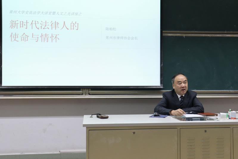 11月8日晚,“史良法学院大讲堂”第十三讲在白云校区南一阶开讲。常州市律师协会会长、江苏正气浩然律师事务所主任陆柏松作《新时代法律人的使命与情怀》讲座,学院2019级本科生、部分研究生参加讲座。