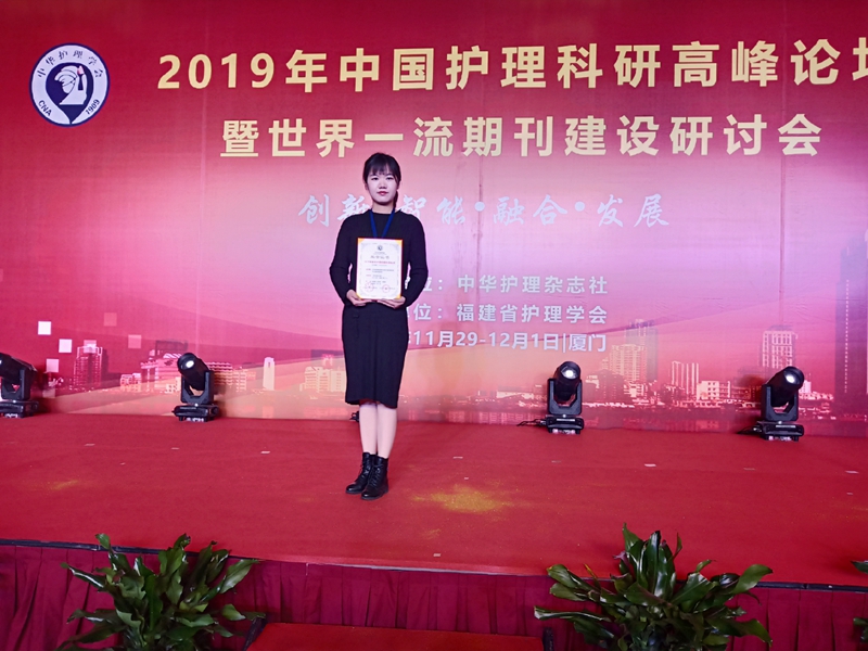 近日,2019年中国护理科研高峰论坛暨世界一流期刊建设研讨会在福建省厦门市举办。我校护理学院张媛媛老师发表在《现代临床护理》上的论文《老年结肠镜检查患者肠道准备关键点指导方案的构建研究》荣获2019年中华护理“百篇优秀论文奖”,张媛媛在大会开幕式上接受颁奖。