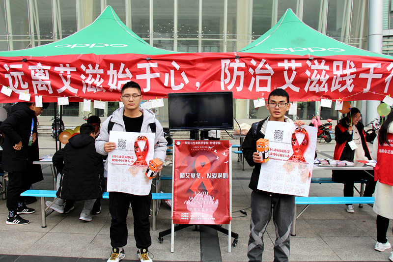 在第29个世界艾滋病宣传日来临之际,制药与生命科学学院 护理学院联合校医疗保健中心在水月广场举办了以“遏艾寒冬 以爱浥心”为主题的艾滋病日宣传活动。院党委书记张继延、后管处党总支书记陈粲及相关教师到场指导。