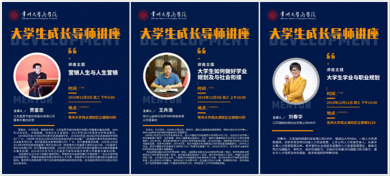 12月,学院邀请大学生成长导师为2019级营销、会计、国贸等专业开展了系列讲座。贾富忠以“成长路上,与你同行”为主题,通过回顾他及他这一辈企业家的创业经历,从理论与实践方面生动形象地讲解了“如何做好人生销售”及“如何做好一名销售人员”;王舟浩以“大学生如何做好学业规划与社会衔接”为主题,结合当前时代背景,由宏观到微观,引用多则小故事,让学生对学业规划的作用有了深刻认识。刘春华以“大学生学业与职业规划”为主题,结合自身工作经历,给同学们提出了宝贵建议,鼓励同学们努力提高能力,明确未来规划。