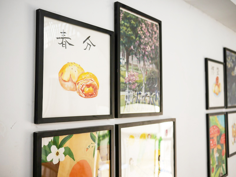 “二十四节气饮食养生图谱”以节气为主题,题材包括时令养生菜品、当季校园风景、日常生活起居等,共计96幅,画作由美术与设计学院同学手绘完成。画作陈列在科教城校区第一餐厅西楼道,辅以健康膳食宝塔大型墙绘,其中季节变换、节气交替的养生方法和食谱,为师生在不同季节时令里安排日常饮食起居提供了有益指导,集艺术性和科普性于一体。后期,营养研究院将以“鱼米之乡”为主题,用我校学生作品作为主要装饰完成健康营养餐厅的文化氛围布置,通过内涵丰富,、典雅别致的就餐环境向师生传达健康膳食理念。