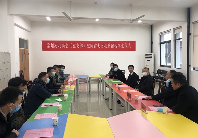 1月26日上午,常州市河北商会(党支部)一行到我校慰问河北籍留校学生。常州市河北商会会长冯维亚,商会监事长谷自战,商会党支部书记陈飞,常务副会长贺勋、刘子海、张立红,副会长张建峰,常州大学党委研究生工作部部长柳铭、石油工程学院党委书记王永利和学院教师代表,以及来自石油工程学院、机械与轨道交通学院、石油化工学院、美术与设计学院等河北籍留校学生代表参加座谈。