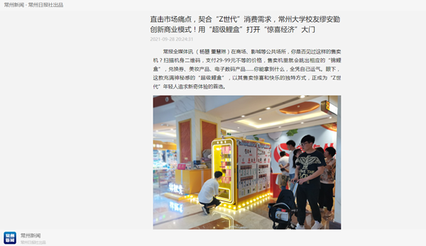 推出这款售卖机的,是常州大学2017届校友缪安勤和他执掌的常州牧鲸科技股份有限公司。公司以“新传媒+新零售”为发展模式,致力于用盲盒帮助品牌方推广优质产品,节省市场营销费用。截至目前,“超级鲤盒”已累计卖出1700万只,年销售额过亿,开启“以新为潮、个性新颖”的新兴消费模式。