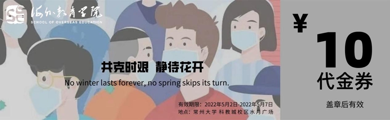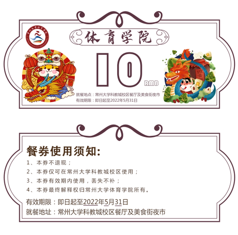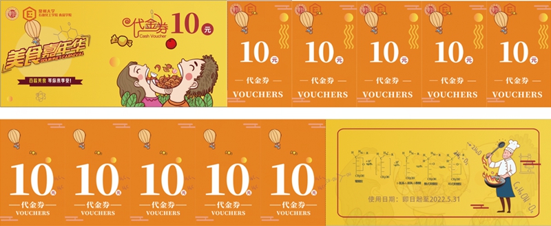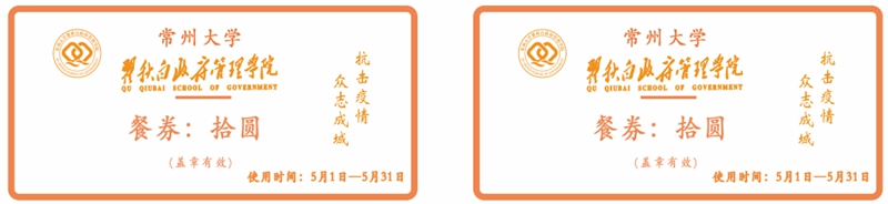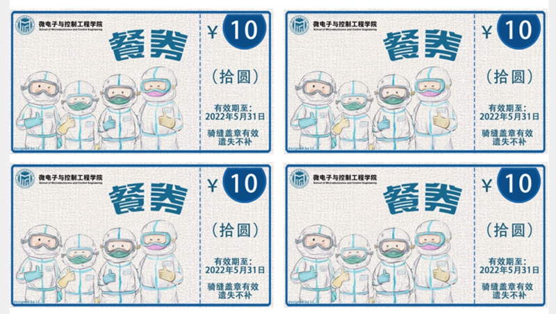 每张餐券除了具备给学生“免费加餐”的功能外,还被赋予了独特的常大情怀和文化内涵,倾注了各学院为学生准备的满满心意。石化学院以“美拉德反应”为关键词,将美食与专业特色完美融合;药学院将餐券设计为以“五星”符号为主体的游乐园门票形式,寓意“药”你游园、“医”饱美食、“护”暖“吾心”,表达对学生最深的惦念;石工学院借学院吉祥物“小油滴”送去关心祝福,号召学子蓄“石”待发,大“油”可为;材料学院以“更上一层楼”为关键词制作一套五张的精美餐券,汇聚对“材”子“材”女的深情寄托;法学院将餐券设计为以獬豸为主体的复古粮票,既体现学校温暖关怀又象征法律善辨曲直;外院将餐券设计为机票形式,寄语同学们搭乘“梦想”专机在“疫”线起飞;体院将餐券融入双龙并行元素,彰显体院师生拼搏向上的精神,激励体育健儿们茁壮成长,争做龙的传人……