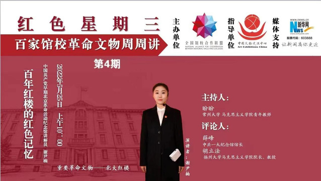 5月25日,为推动用好用活革命文物工作,以实际行动迎接党的二十大胜利召开,由全国馆校合作联盟主办,中国文物交流中心指导,新华网作为媒体支持,常州大学马克思主义学院、常州大学近现代史与红色文化研究院联袂推出“红色星期三——百家馆校革命文物周周讲”系列专栏第4期网络课程活动。本期邀请中国共产党早期北京革命活动纪念馆讲解员谢尹楠担任主讲人,中共一大纪念馆党委书记、馆长薛峰,扬州大学马克思主义学院院长胡立法担任点评嘉宾。来自全国馆校合作联盟理事单位的常州大学、扬州大学、中国共产党早期北京革命活动纪念馆、中共一大纪念馆、孔繁森同志纪念馆等高校部分师生及博物馆人,通过线上参加活动。