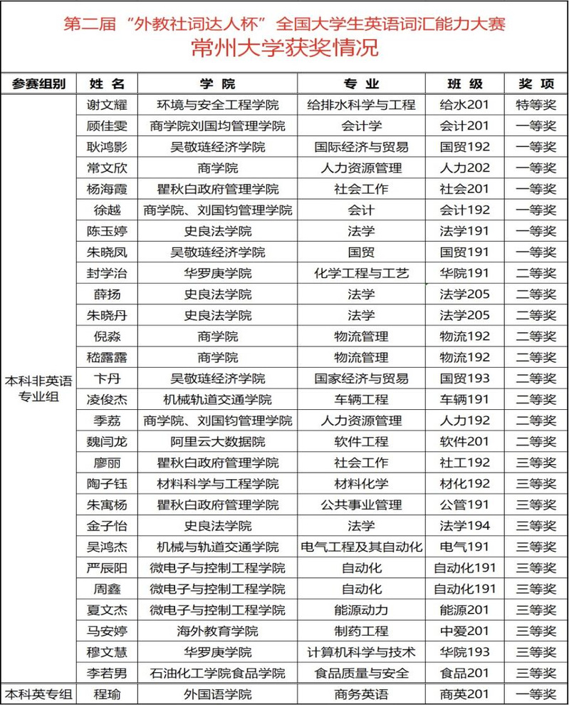 近日,第二届“外教社·词达人杯”全国大学生英语词汇大赛江苏省决赛成绩揭晓,我校参赛学生取得喜人成绩。入选决赛的41名学生中,环境与安全工程学院 城市建设学院(筹) 应急管理科学与工程学院给排水科学与工程201班的谢文耀同学获本科非英语专业组特等奖,商学院 刘国钧管理学院会计201班顾佳雯等7名同学获一等奖,华罗庚学院 机器人产业学院 中以科创学院化学工程与工艺191班封学治等9名同学获二等奖,瞿秋白政府管理学院社会工作192班廖丽等11名同学获三等奖;外国语学院商务英语201班程瑜同学获本科英语专业组一等奖。谢文耀同学将代表我校参加全国决赛,与来自全国高校的词汇达人同台竞技。