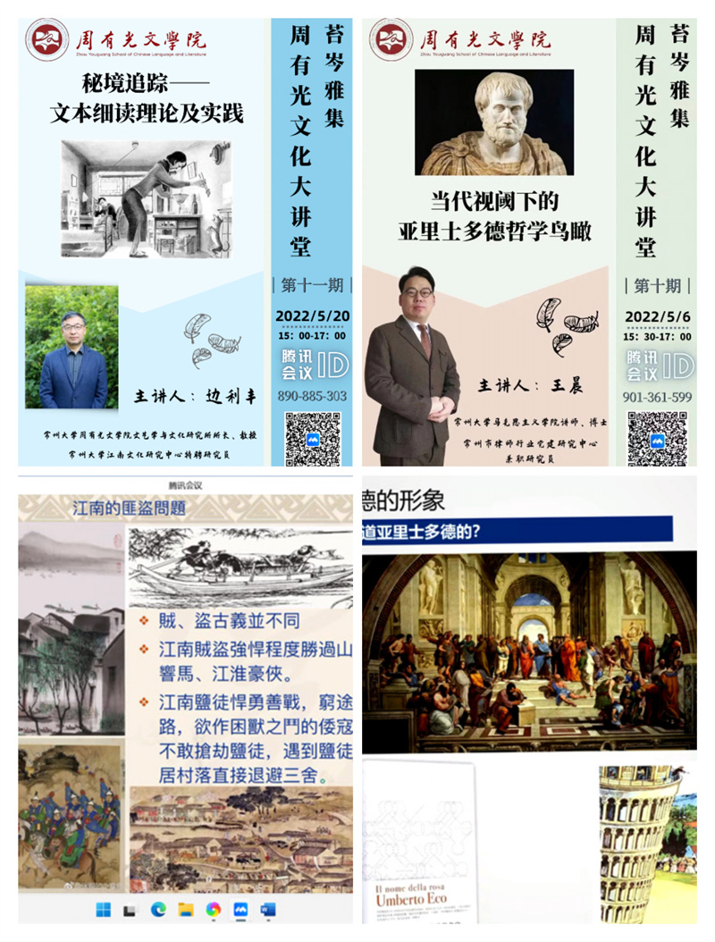 周有光文化大讲堂活动在周有光基金的支持下,邀请院内外专家开设专题讲座,内容涵盖文学与社会、文学与历史、文学与地方文化、文学与哲学、文学与传播,围绕《权力·空间·文化—京杭大运河对江南水乡古镇的形塑与影响》《俄罗斯诗歌的“月亮”与“凤凰”》《消失的艺术:后工业时代的“短视频”生产》《韩国电影的现实表达与文化想象》《秘境追踪——文本细读理论及实践》《当代视阈下的亚里士多德哲学鸟瞰》《英国社会转型时期乡村诗歌》《晚明江南社会治安》等主题,通过文本研读、作品赏析、思想阐释、传播分析、专题研究等不同角度,展现文学与不同学科的融合,让大家在充分领略语言文学之美的同时,潜移默化接受专业知识熏陶,形成文学与其他学科融合的自觉,涵养学术兴趣与品位,为开拓未知世界打下基础。