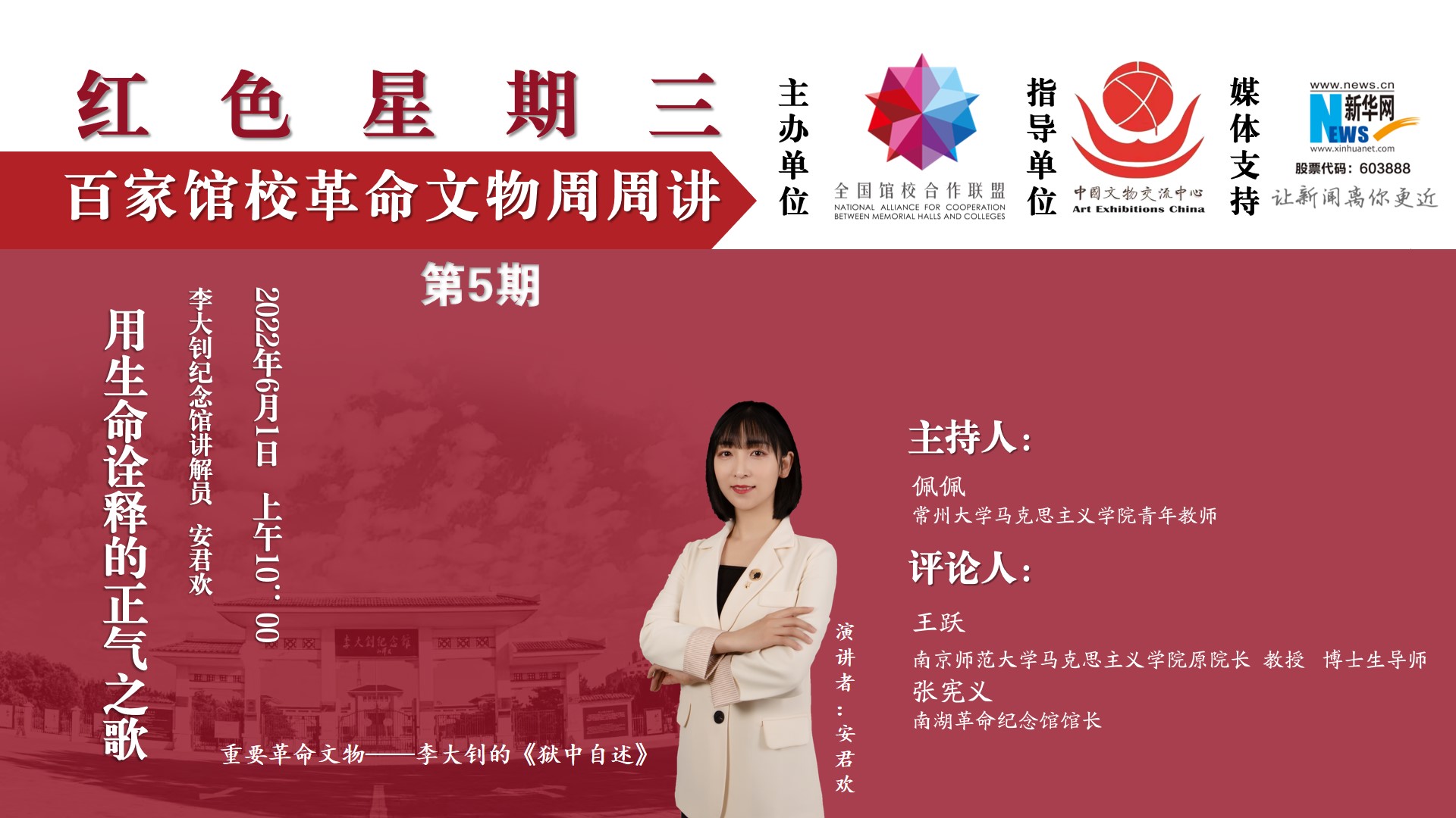6月1日,恰逢国际儿童节,“红色星期三——百家馆校革命文物周周讲”专栏第5期推出青少年永远的导师李大钊气壮山河的革命文献《狱中自述》,从中见证李大钊同志对革命事业的无限忠诚。本期邀请李大钊纪念馆讲解员安君欢担任主讲人,南京师范大学马克思主义学院原院长王跃教授,南湖革命纪念馆馆长张宪义担任点评嘉宾。来自全国馆校合作联盟理事单位的常州大学、南京师范大学、聊城职业技术学院、李大钊纪念馆、南湖革命纪念馆等高校部分师生及博物馆人,通过线上方式参加活动。