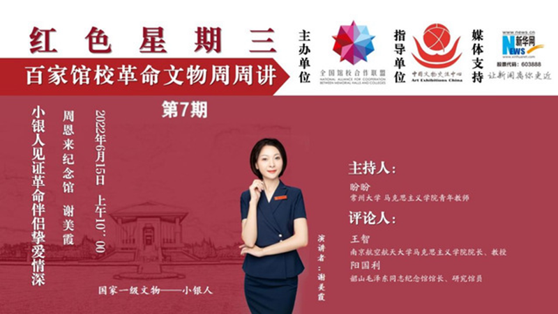 6月15日,由全国馆校合作联盟主办,中国文物交流中心指导,常州大学马克思主义学院、常州大学近现代史与红色文化研究院联袂推出“红色星期三—百家馆校革命文物周周讲”系列专栏第7期网络课程。本期邀请全国五好讲解员、周恩来纪念馆谢美霞担任主讲人,南京航空航天大学马克思主义学院院长王智,韶山毛泽东同志纪念馆馆长阳国利研究馆员担任点评嘉宾。来自全国馆校合作联盟理事单位的北京高校思想政治工作研究中心、常州大学、南京航空航天大学、江南大学、徐州工程学院、山东聊城职业学院、韶山毛泽东同志纪念馆、山东博山焦裕禄纪念馆等高校部分师生及博物馆人,通过线上方式参加活动。
