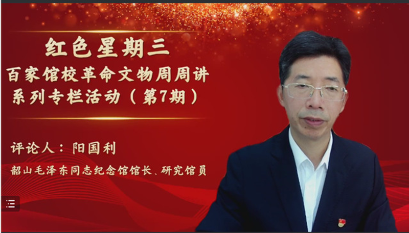 据了解,“红色星期三——百家馆校革命文物周周讲”系列专栏活动从今年5月4日开讲后,已连续举办7期,先后由上海中共一大会址纪念馆、南湖革命纪念馆、天津大学张太雷纪念室、北大红楼旧址纪念馆、李大钊纪念馆、韶山毛泽东同志纪念馆和周恩来纪念馆的讲解员,各自讲述一件重要的革命文物故事。下一期活动拟邀请南昌八一起义纪念馆林彦平老师主讲《石破天惊第一枪》。(通讯员/陈虎腾 审核/朱成山 编辑/孙悦)