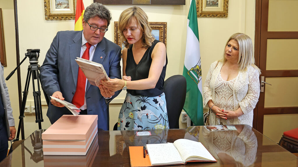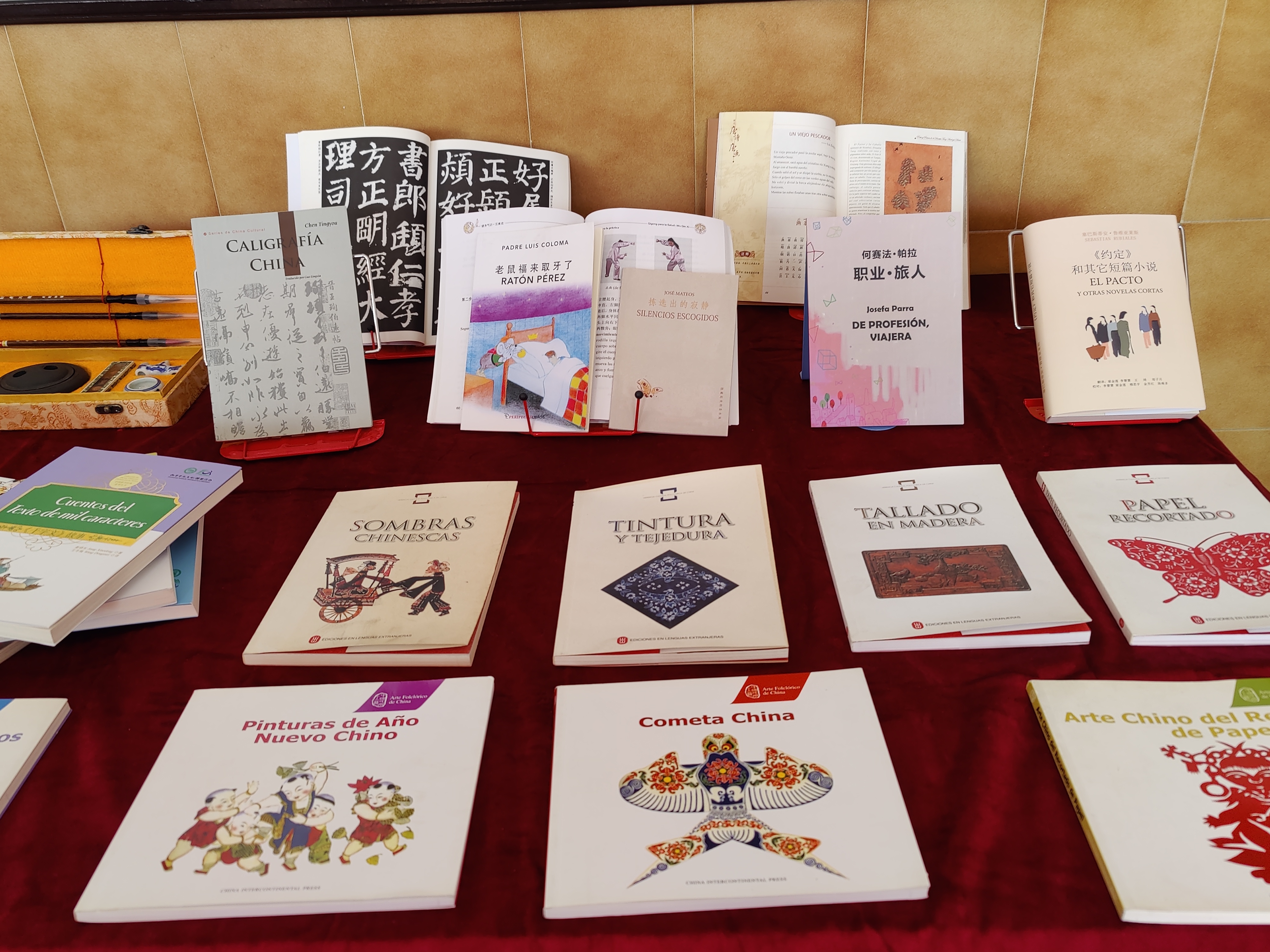 阿莱格里亚在学校荣誉集上签名,孔子课堂的老师们为她赠送了近年来翻译出版的图书《老虎福来取牙了》《捡选的寂静》《职业·旅人》和《<约定>和其他短篇小说》,充分展示了我校西班牙安达卢西亚大区孔子课堂师生的教学成果。