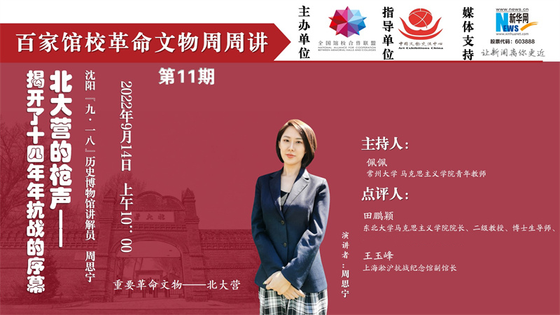 9月14日,由全国馆校合作联盟主办,中国文物交流中心指导,常州大学马克思主义学院、常州大学近现代史与红色文化研究院联袂推出“百家馆校革命文物周周讲”系列专栏第11期网络课程活动。本期邀请沈阳“九·一八”历史博物馆讲解员周思宁担任讲述人,东北大学马克思主义学院院长、二级教授、博士生导师、教育部特聘教授田鹏颖,上海淞沪抗战纪念馆副馆长王玉峰担任点评人。来自全国馆校合作联盟理事单位的常州大学、东北大学、上海淞沪抗战纪念馆、孔繁森精神党性教育基地等高校部分师生及博物馆人,通过线上方式参加活动。